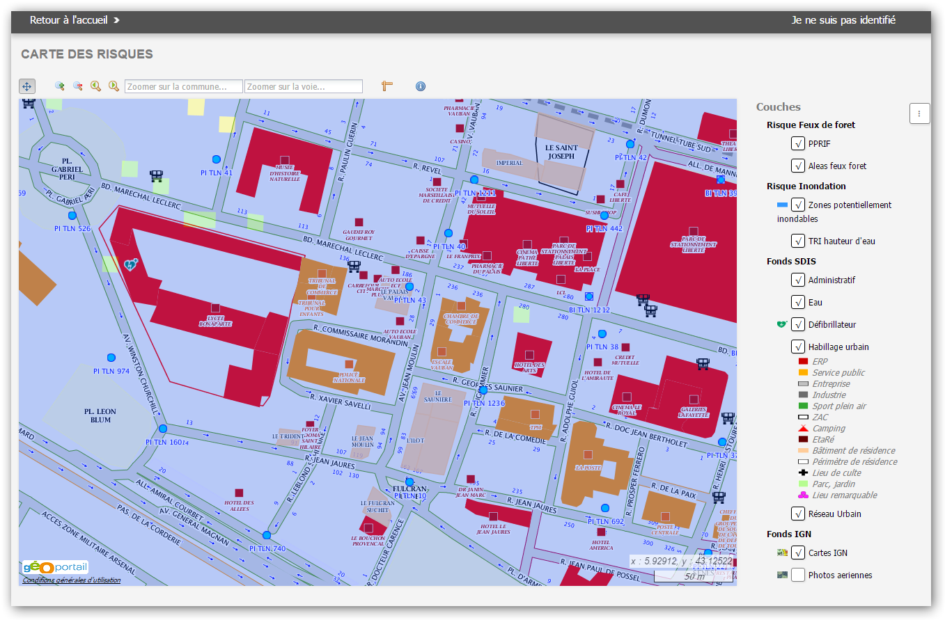Un module de la plate-forme est dédié aux « risques » permettant l’affichage de couches de données KML dans la thématique urbaine. Ce module permet de partager des informations cartographiques liées aux risques de différentes natures.