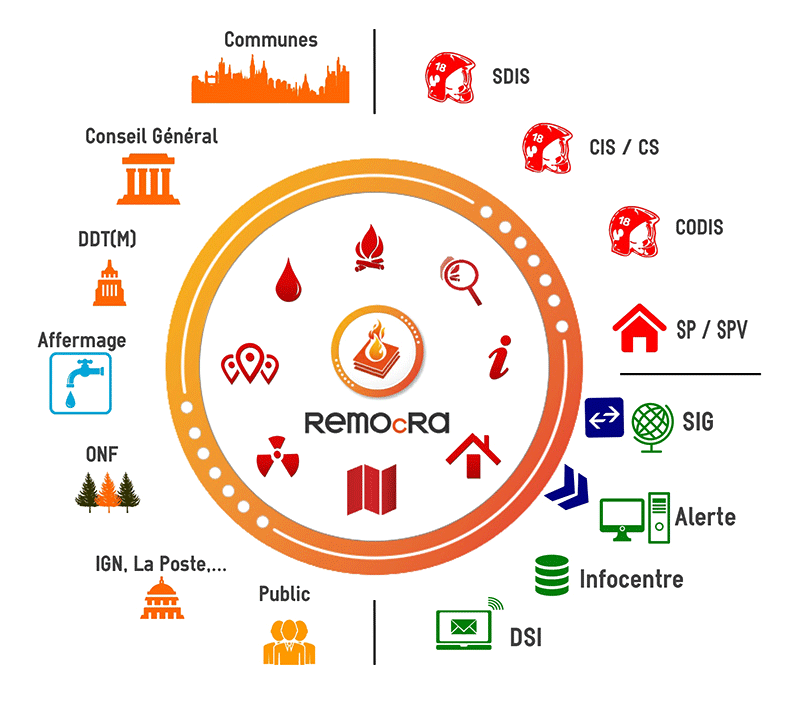 REMOcRA est une plate-forme collaborative destinée en premier lieu aux SDIS et aux CIS, mais également conçue pour dématérialiser et automatiser les échanges documentaires avec les partenaires institutionnels comme : communes, EPIC, sociétés d'affermage, DDT & DDTM.