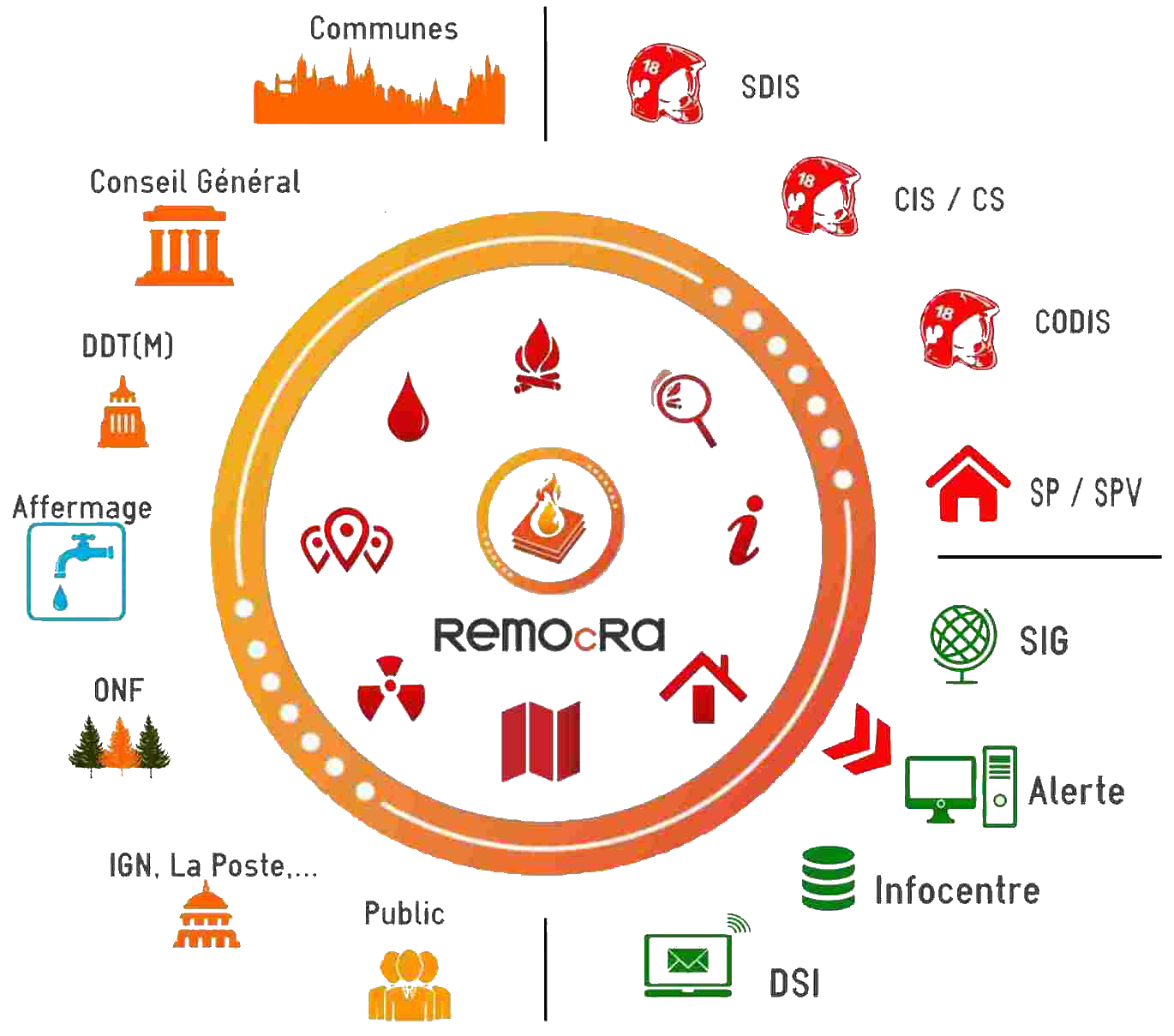 REMOcRA est une plate-forme collaborative destinée en premier lieu aux SDIS et aux CIS, mais également conçue pour simplifier et automatiser les échanges avec les partenaires institutionnels comme :
